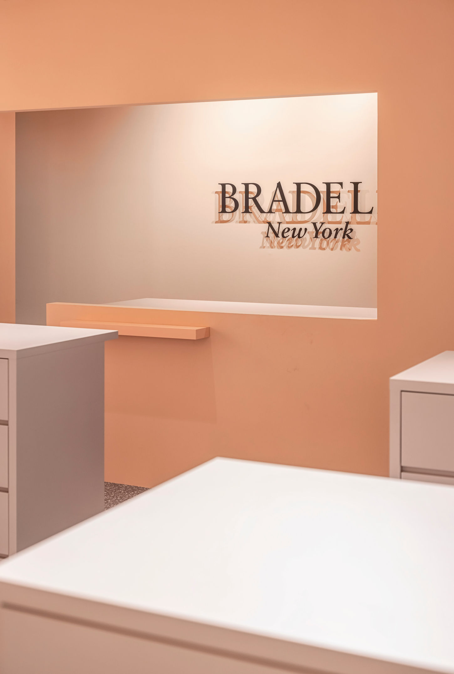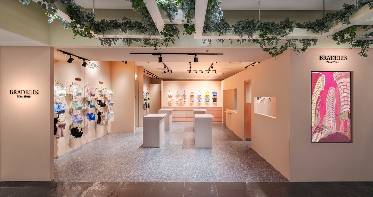 独自の3ステップシステムでボディメイクする補整下着ブランド『ブラデリスニューヨーク(BRADELIS New York)』の 新宿マルイ店のフロア移転に伴い、内装デザインを一新。従来のデザイン要素を引き継ぎつつ、新しいアプローチを 取り入れた。これまで商品と内装装飾が一体となり、独自の世界観を演出していましたが、今回は内装装飾を可能 なかぎり削ぎ落し商品の魅力が際立つような空間づくりに注力した。壁面や天井はAEP塗装のパステルピンクで統 一し、ブランドらしさを保ちながらも背景として控えめな存在にし、ダクトレールライトで個々の商品に照明を当てるこ とで、商品が主役となる空間を創り出した。さらに、商品陳列棚をミニマルにデザインし、全ての売場照明をダクト レールライトで対応することで、さまざまな陳列方法や商品に柔軟に対応できるフレキシビリティを提供している。当 ブランドではお客様の体型に合わせたセミオーダーサービスを提供しており、店内に設置された2台のミシンで商品 を調整している。このミシン台を廊下に面した右手前に配置することで、新規のお客様にもサービスの存在をアピー ルする狙いがある。20~30代を主要顧客層とする新宿マルイ店において、新たな内装デザインを通じて、より一層 商品の魅力をお客様にお伝えできる空間を目指した。